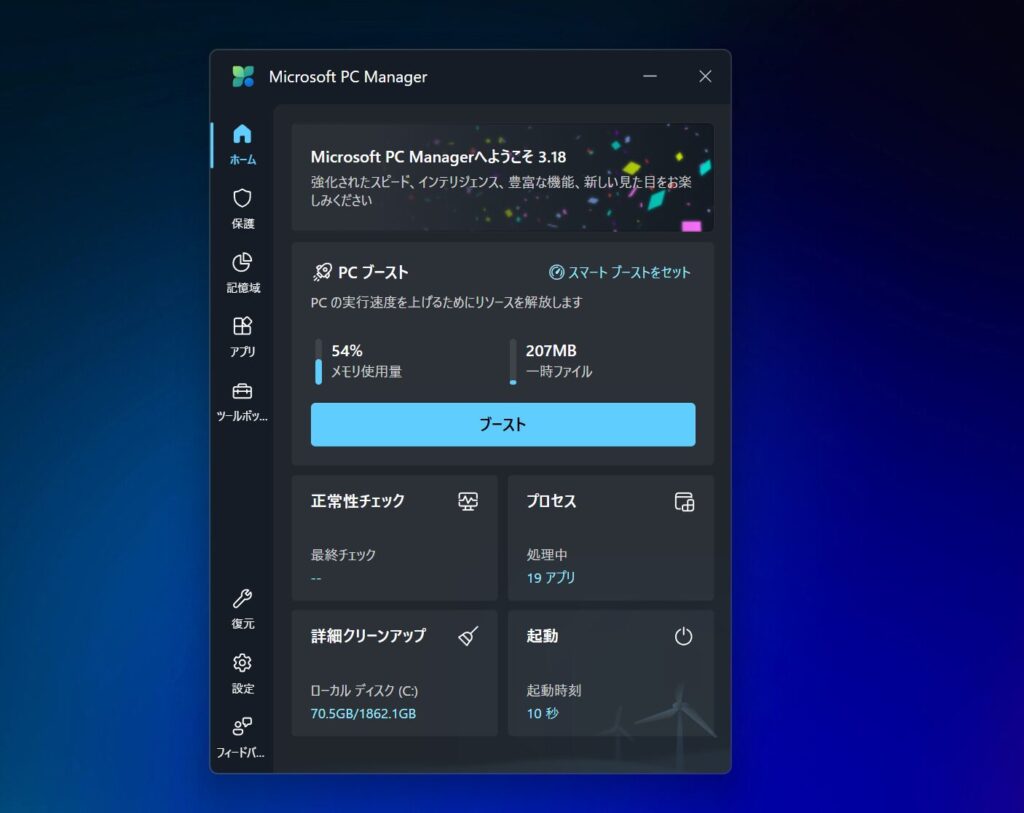 ここまで紹介した方法は、どれも手動での設定が必要でした。「もっと簡単に、一発でメモリを解放したい!」という方におすすめなのが、Microsoft PC Managerです。