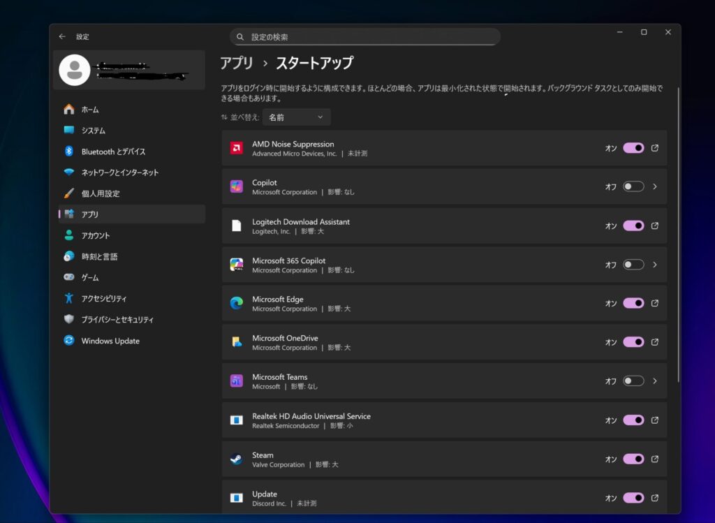 - スタートアップアプリの設定変更が反映される
