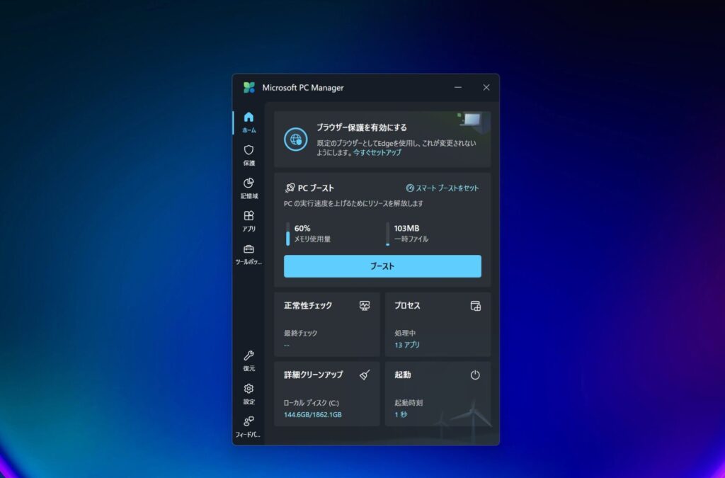 そこで私が愛用しているのが、Microsoftが無料で提供している「Microsoft PC Manager」です。このアプリは、PCの状態を一目で把握できるユーザーフレンドリーなインターフェースが特徴で、最適化ツールも充実しています。