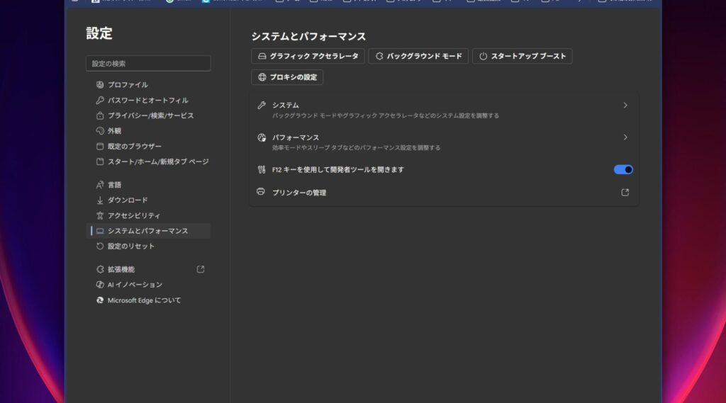 - 「Microsoft Edgeを閉じるときにバックグラウンドプロセスの実行を続ける」をオフ
