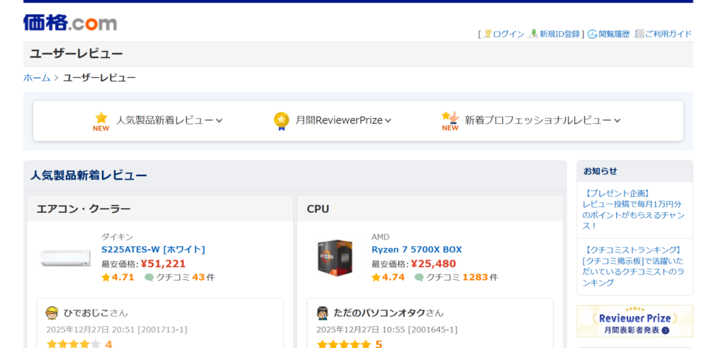 - 価格.com:実際の購入者レビューと専門家評価の両方