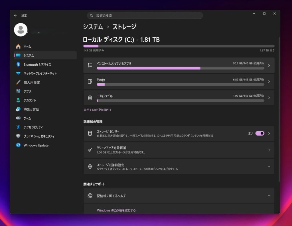 - 「設定」 > 「システム」 > 「ストレージ」 を開く。