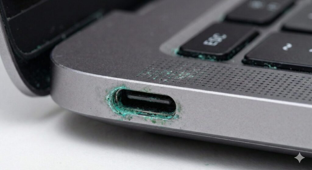 特にダメージを受けやすいのが、外部に露出している「接続端子(USBポートや充電ポート)」です。ここは常に空気に触れているため、真っ先に錆び始めます。