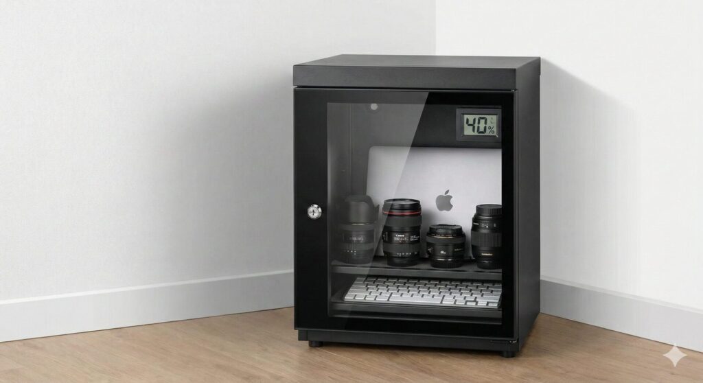 - 【最強】電子防湿庫(予算:3万円〜) カメラ愛好家御用達のアイテムですが、PCやキーボードにも最適です。コンセントに繋いでおけば、全自動で常に最適な湿度(40〜50%程度)を保ってくれます。電気代も月数十円程度と激安。初期投資はかかりますが、MacBookを買い替えるコストを考えれば安い保険です。HAKUBAや東洋リビングといったメーカーが信頼性が高くておすすめです。