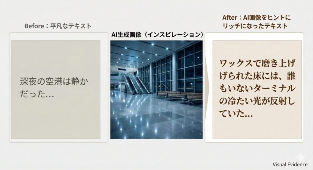 AI画像から得た「床の反射」「ベンチの距離感」「キャリーケースを握る手」という具体的なビジュアルを、自分の文章に組み込みます。