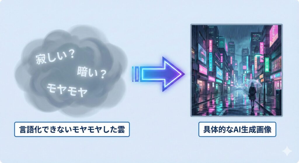 これだけだと、ありきたりな表現しか出てきませんよね。でも、この「なんとなく」をAIに投げてみると、想像もしなかった角度で具体的なビジュアルを返してくれます。
