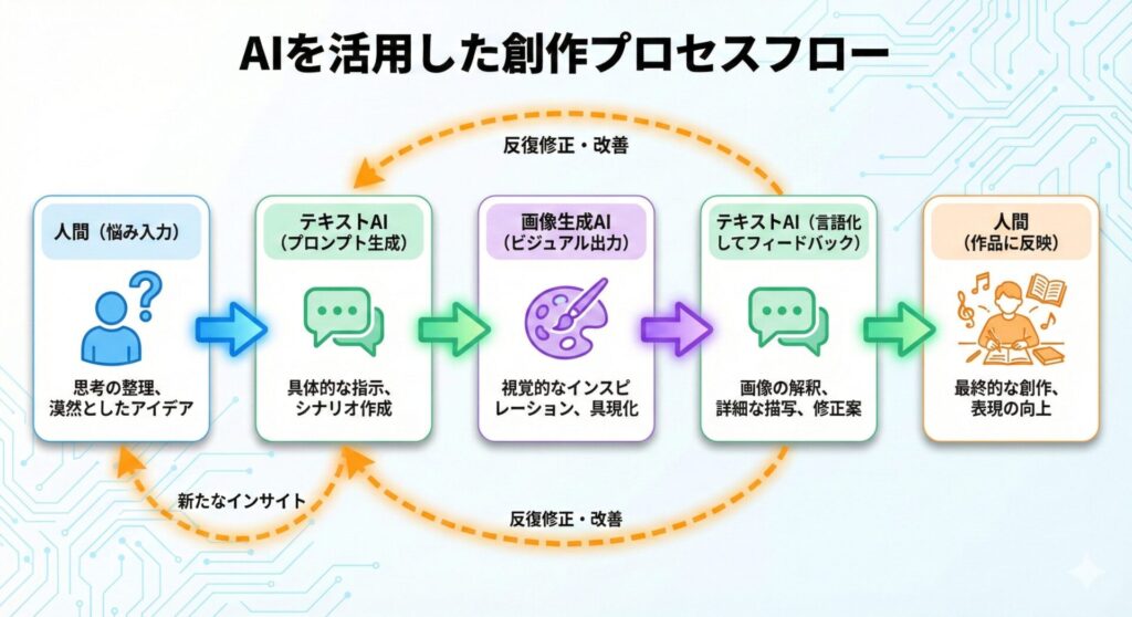 AIに作品を「作らせる」のではありません。AIを最強の「壁打ち相手」にして、自分の脳内にあるモヤモヤしたイメージを強制的に視覚化する方法です。