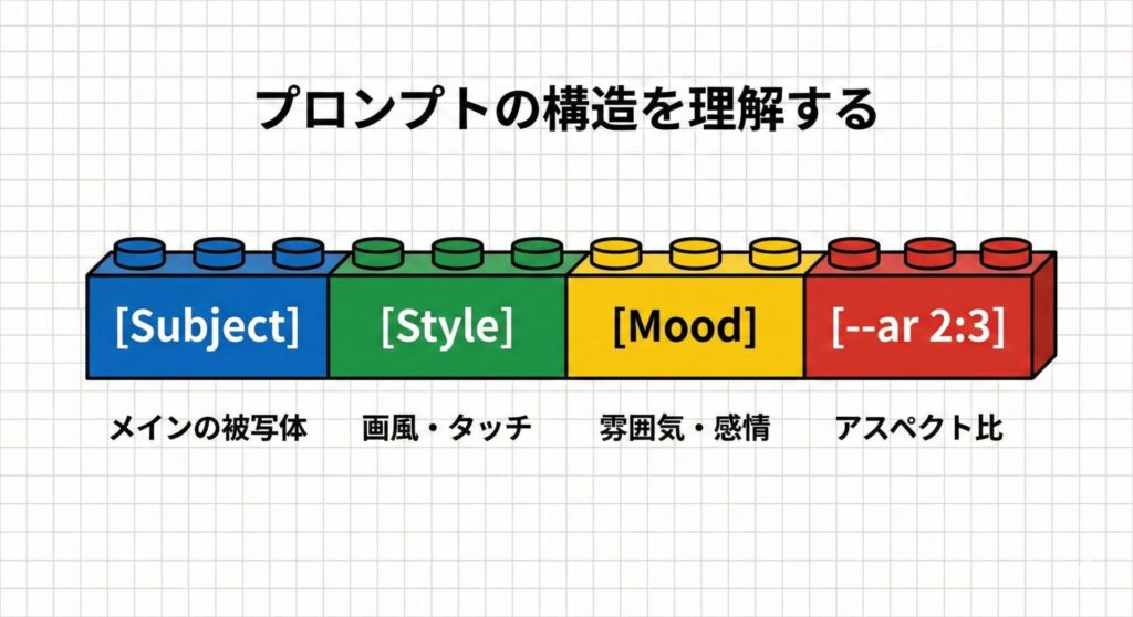 - ④ 技術パラメータ:縦横比など(例:–ar 2:3)