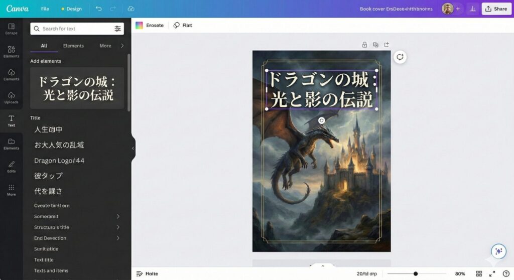 - Canva(無料版でもOK、有料版なら最強): 生成した画像をアップロードし、その上から「明朝体」や「ゴシック体」でタイトルを入れます。
