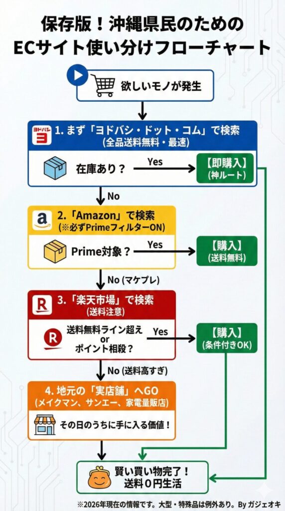 一般的に「どれも便利」と言われますが、沖縄においては明確なヒエラルキーが存在します。結論から言うと、「Amazonとヨドバシの二刀流」が最強です。
