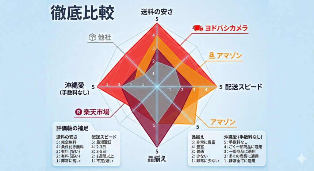 ここからは、沖縄県民の命綱である3大ECサイト(Amazon、ヨドバシ・ドット・コム、楽天市場)の2026年現在の実力を、私の独断と偏見、そして実体験に基づいて徹底比較します。