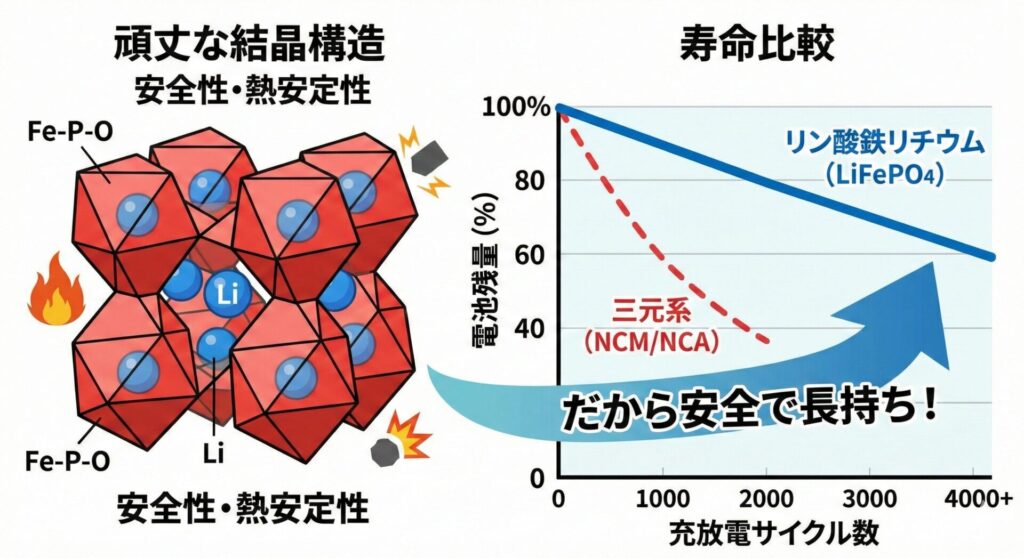 リン酸鉄リチウムは、電池の結晶構造が非常に強固で、釘を刺しても発火しないと言われるほど安全性が高いんです。 さらに、寿命(サイクル数)が段違い。
