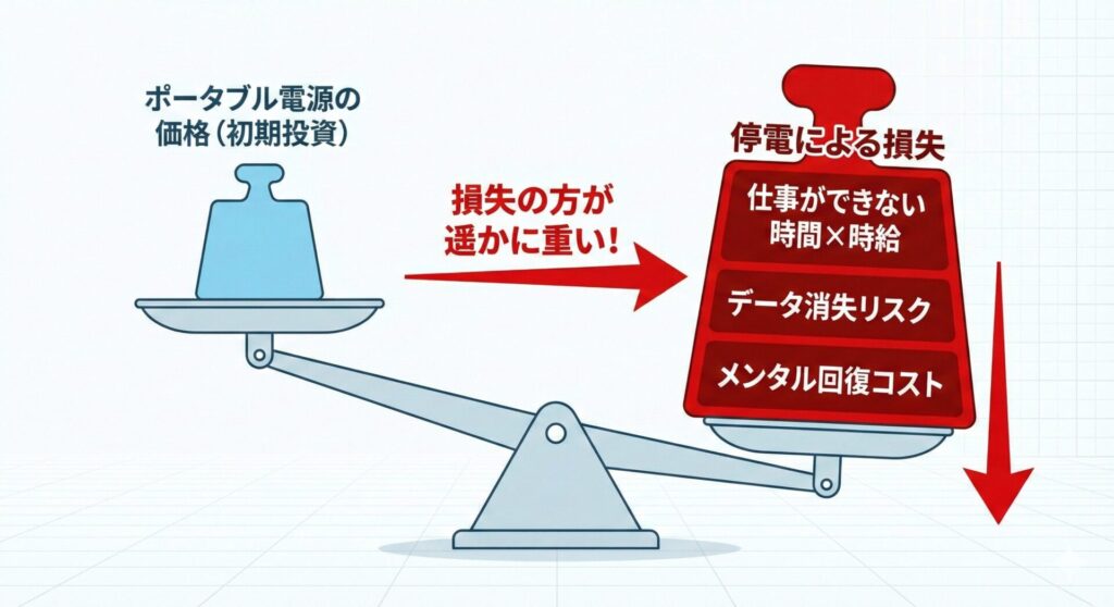私たちフリーランスや個人事業主にとって、時間は商品そのものです。 例えば、台風で丸2日停電したとします。 単なる売上の損失だけではありません。「納期に遅れるかもしれない」という信用リスク、そして何より、一度崩れたリズムとメンタルを立て直すのにかかる「復旧コスト」。