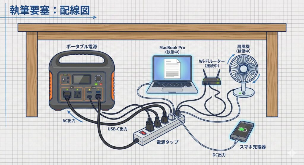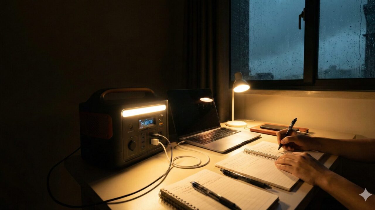 しかし、私のデスクの上だけは別世界。 ポータブル電源(私はEcoFlow DELTA 2を使用しています)が「カチッ」と微かな音を立ててバッテリー駆動に切り替わり、モニターの明かりは一度も瞬くことなく、書きかけの原稿を照らし続けました。 そして何より、足元の扇風機が、何事もなかったかのように首を振り続けている。