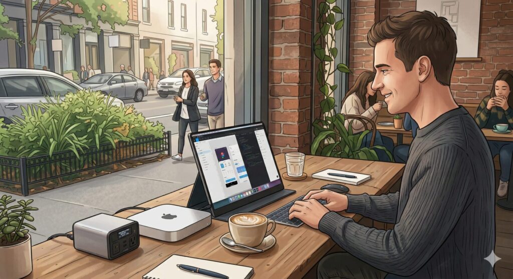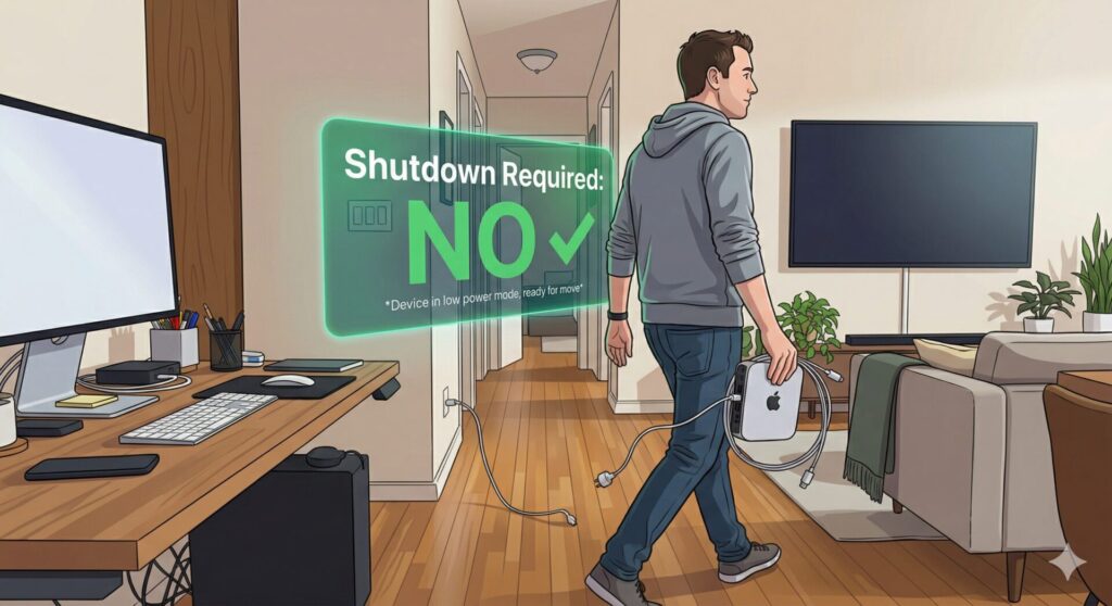 しかしMac miniは、どれほど小型軽量になっても、本質的には「据え置き型」のデスクトップPCです。電源コードが命綱であり、それを抜くことはデバイスの死(シャットダウン)を意味します。